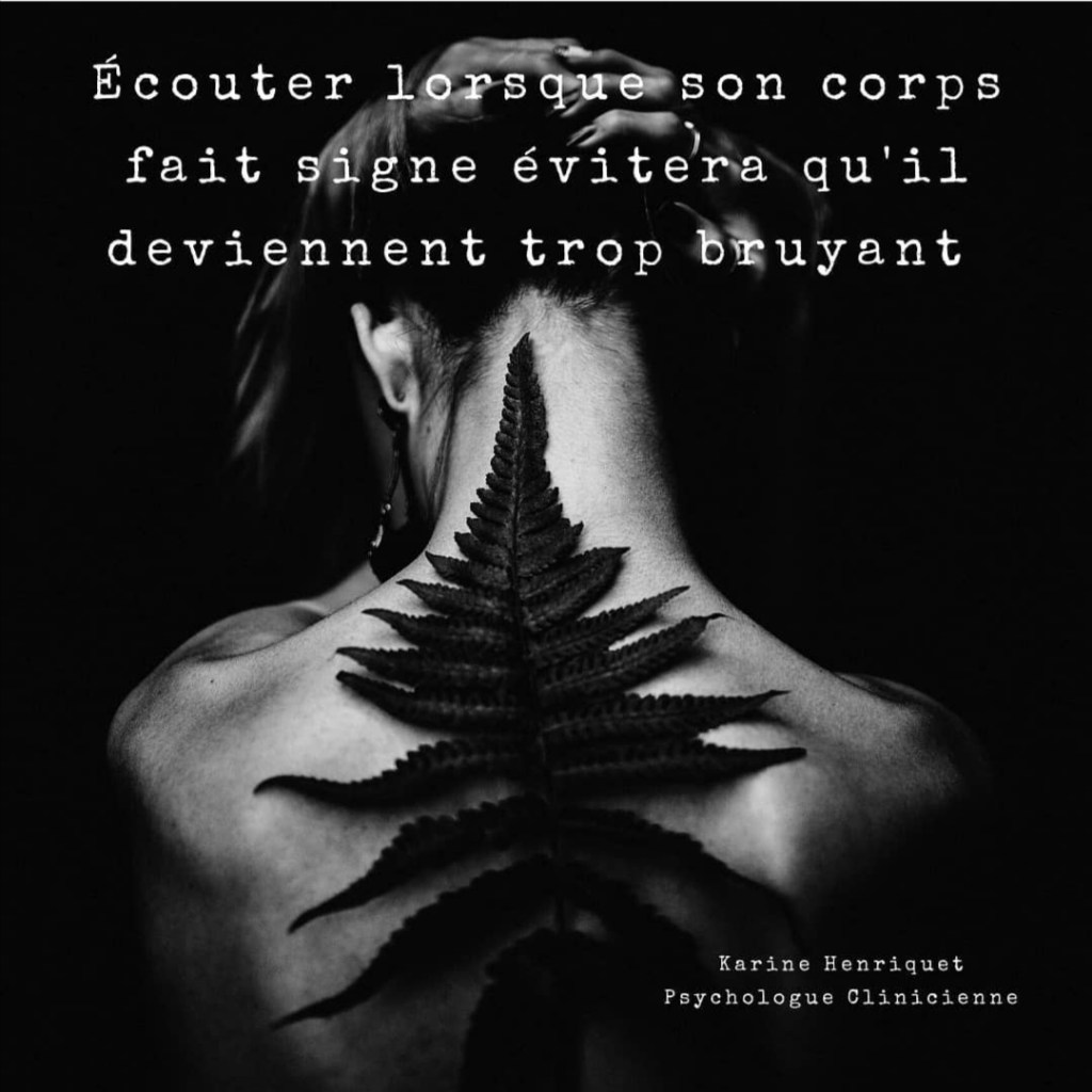 Véritable indice qu’il existe un impossible à exprimer, le corps devient alors le seul lieu d’expression par la mise en place du symptôme corporel ou somatique. Écouter son corps, c’est s’écouter soi. Dans ce prendre soin de son corps c’est prendre soin de soi là où il n’a sans doute pas été possible auparavant. Il n’est jamais trop tard pour s’écouter.